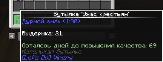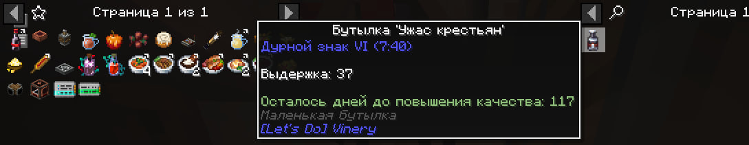 День добрый, а я тут заметил что спустя колосальное кол-во времени мои вина не усиляют свой эффект... вот смотрите: за 37 этапов выдержки вино из JEI поднилось до эффекта 6 лвл + надбавка вреени. Моё же вино на 21 этапе вообще не усилилось. это невозможно! вино дожно хоть чуть-чуть усилиться.